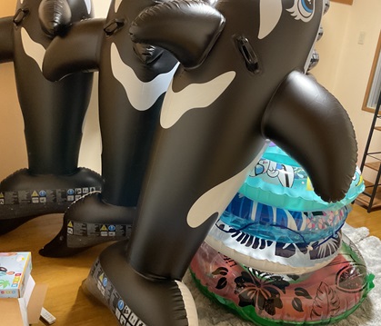 INTEXのシャチフロートが3体と90cmサイズの浮き輪が3個、120cmサイズの浮き輪が1個です。やはり、シャチ君はいいですね! |