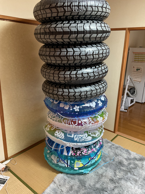浮き輪タワーを作ってみました。90cmサイズの浮き輪が5個とINTEXの91cmサイズのタイヤチューブ浮き輪が5個あります。 |